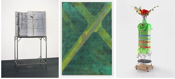 Image: Isa Genzken, Door (Tür), 1988, concrete and steel, The Rachofsky Collection and the Dallas Museum of Art through the DMA/amfAR Benefit Auction Fund, © Isa Genzken; Isa Genzken, MLR, 1992, lacquer on canvas, Lonti Ebers, New York, Courtesy the artist and Galerie Buchholz, Cologne/Berlin, © Isa Genzken; Isa Genzken, Hospital (Ground Zero), 2008, metal tray dolly, plastic flowers in spray-painted vase, ribbon, metal, mirror foil, synthetic polymer paint on fabric, shot glasses, fiberboard, and casters, Collection Charles Asprey, Courtesy the artist and Galerie Buchholz, Cologne/Berlin, © Isa Genzken