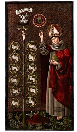 Image:  The Segovia Master (active in Castille, Spain, c. 1500), St. Bonaventure with the Tree of Life, c. 1490, oil, gold leaf, and silver leaf on panel, Lent by Mr. and Mrs. Thomas Campbell, 28.2014.1